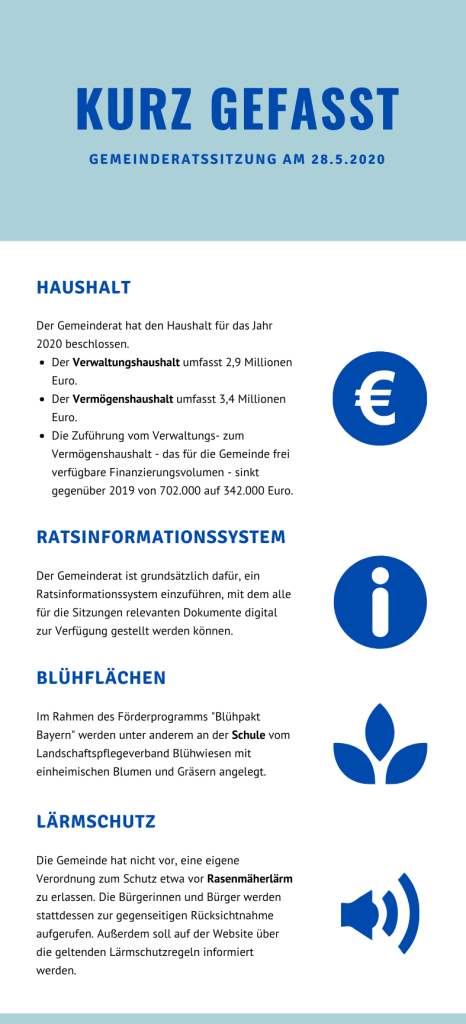 Der Gemeinderat hat in seiner Sitzung am Donnerstag, 28. Mai, den Haushalt für das Jahr 2020 beschlossen. Die Sitzung fand wegen der Abstandsregelungen erneut im Gymnastikraum der Turnhalle statt. Wegen der Corona-Krise rechnet die Gemeinde auch mit deutlich weniger Steuereinnahmen.