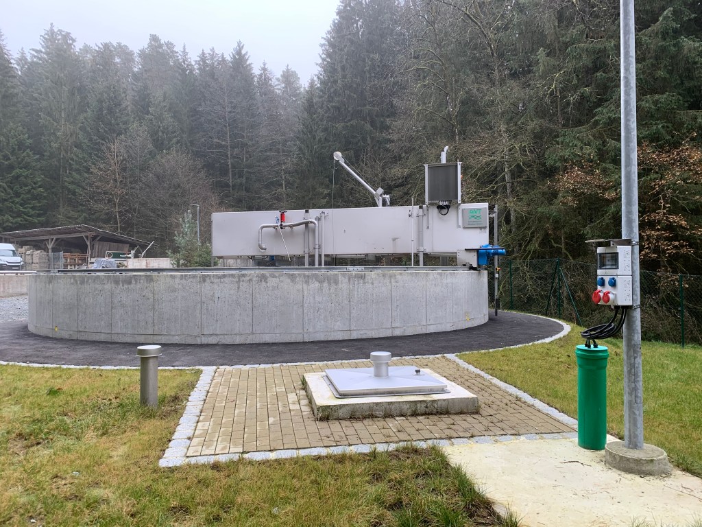 - Ab 2018 wurde in einem zweiten Bauabschnitt dann ein Nachklärbecken errichtet (Bild), in dem das Abwasser von letzten Schlammresten gereinigt wird.