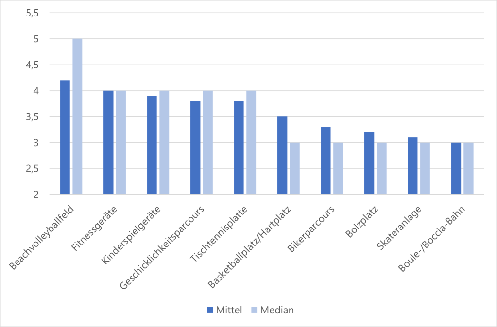 Die Umfrage ergab eine allgemein breite Streuung der Ergebnisse: Jede einzelne der genannten Anlagen erhielt jeweils von mehreren Respondenten die höchste und von mehreren Respondenten die niedrigste Bewertung. Die fünf durchschnittlich am höchsten bewerteten der vorgeschlagenen Ausstattungsgegenstände waren dabei ein Beachvolleyballplatz, Fitnessgeräte, Kinderspielgeräte, ein Geschicklichkeitsparcours sowie eine Tischtennisplatte. Auch die anderen Vorschläge wurden überwiegend positiv bewertet.