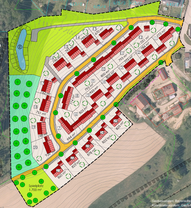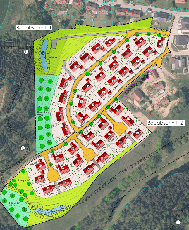 - Eine freie Ausrichtung der Häuser innerhalb der Parzellen würde die Nutzungsmöglichkeiten für Solarenergie verbessern.