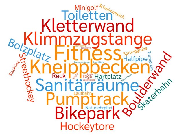 Zusätzlich zu den vorgegeben Antwortmöglichkeiten hatten die Befragten auch die Möglichkeit, selbst in einem Freitextfeld Vorschläge zu unterbreiten, welche Ausstattungsgegenstände sie sich für das Sportgelände wünschen. Insgesamt wurden dabei 180 einzelne Vorschläge unterbreitet. Zu den am häufigsten genannten Vorschlägen zählten dabei eine Fitness-/Calisthenicsanlage, ein Kneippbecken, ein Bikerparcours sowie Sitzgelegenheiten und Sanitärräume. Die wesentlichen Vorschläge sind im Folgenden in einer Wortwolke zusammengefasst, wobei die Größe der Begriffe auf der Häufigkeit der Nennungen basiert.