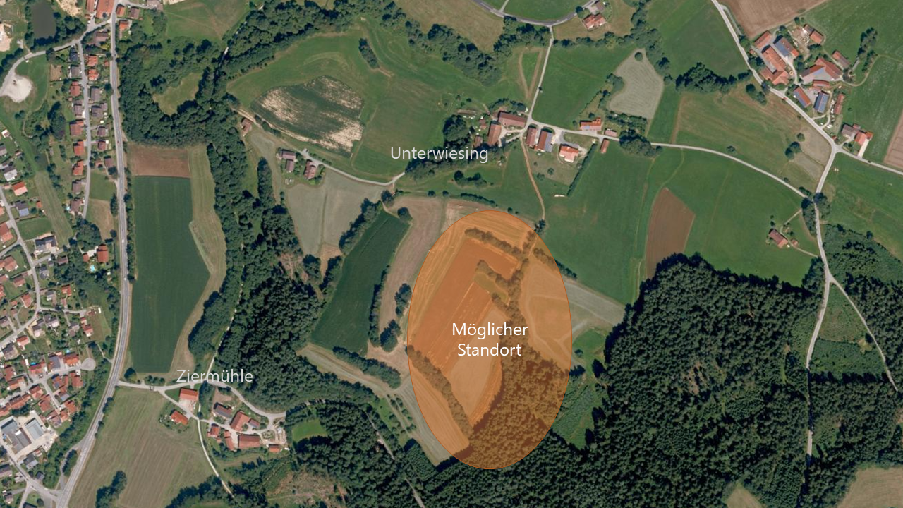 Beide Betreiberunternehmen haben unabhängig voneinander ein Gebiet südlich des Ortsteils Unterwiesing ins Auge gefasst (siehe Skizze unten). Eine definitive Standortentscheidung ist aber noch nicht gefallen; auch eine Baugenehmigung wurde noch nicht beantragt.